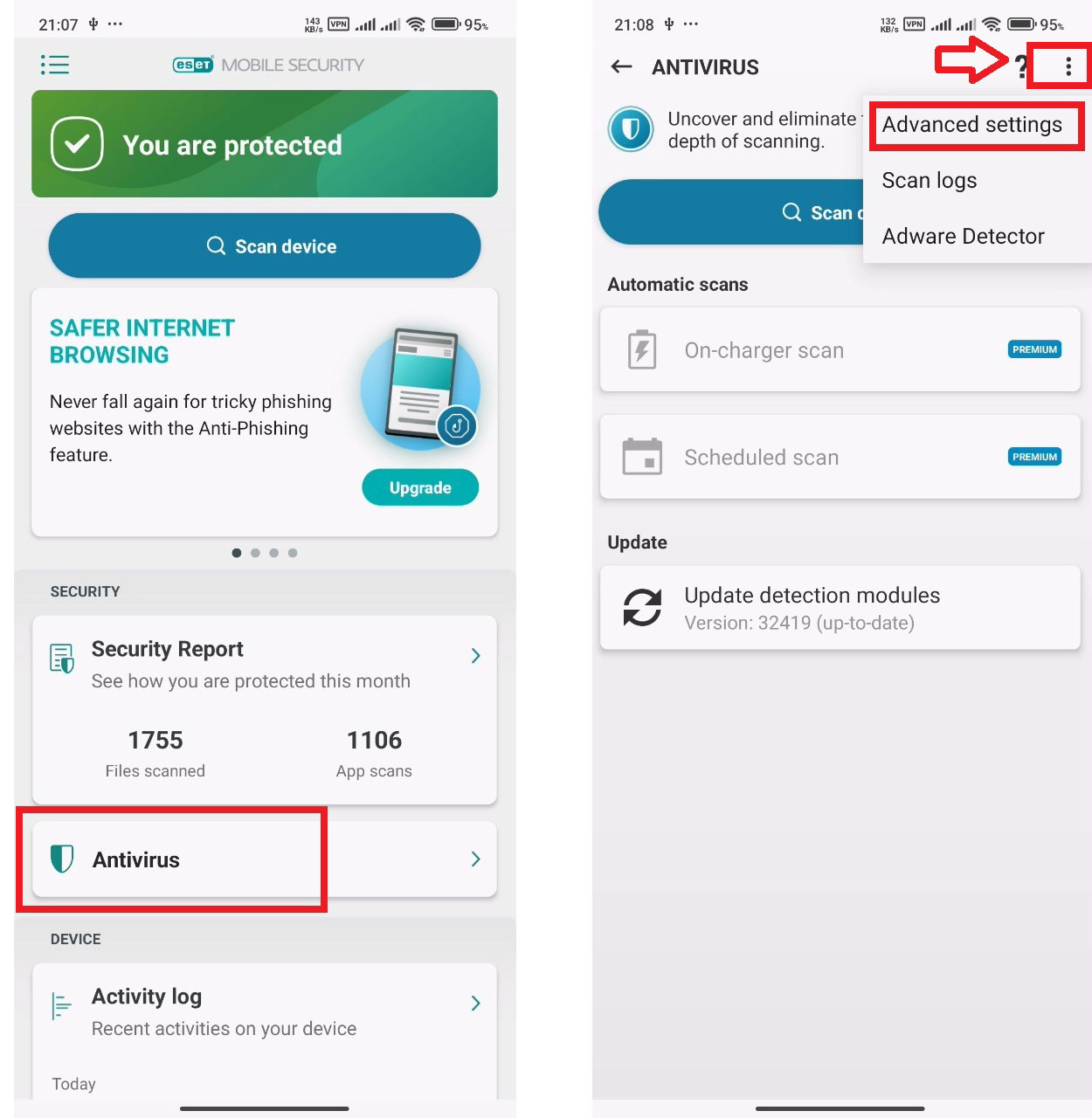 2- در صفحه Antivirus، روی منوی سهنقطه بالا سمت راست بزنید و گزینه Advanced settings را انتخاب کنید.